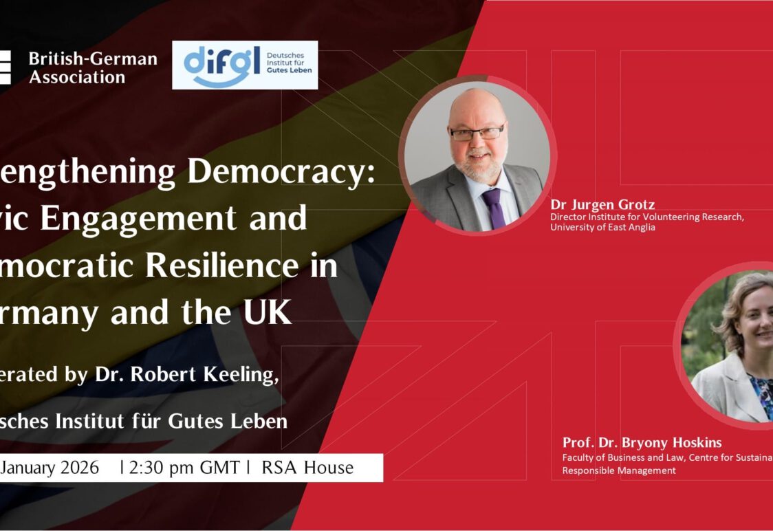 Bürgerbeteiligung und demokratische Resilienz in Deutschland und Großbritannien Wie kann Demokratie unter den Bedingungen von Polarisierung, Desinformation und Vertrauensverlust gestärkt werden? Eine zentrale Antwort liegt in der aktiven Beteiligung von Bürger:innen – im Ehrenamt, in Vereinen, Initiativen und lokalen Gemeinschaften. Vor diesem Hintergrund veranstaltet das Deutsche Institut für Gutes Leben (difgl) gemeinsam mit der British-German Association am 15. Januar 2026 eine […]